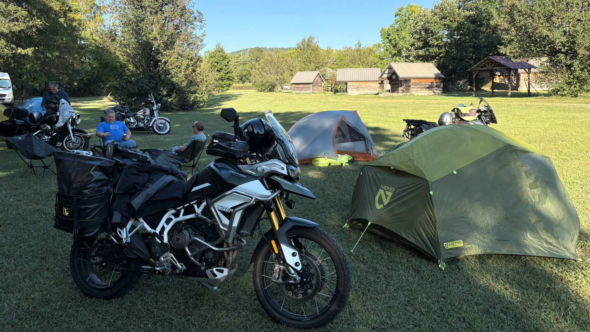 They continued to Robbinsville (via an extensive backroads short cut that… didn’t!) and lunched at an old favorite meat-and-three, Lynn’s Place, while downtown was hopping with a live music festival – timing is everything! From there they beat the heat by riding through the always-shady Nantahala Gorge and rested at the Nantahala Outdoor Center right on the riverbank. Then on to their next home-for-the-night, the Iron Horse Motorcycle Lodge, probably one of the nicest motorcycle-specific resorts east of the Mississippi. Since our day’s mileage was light, we were able to throw up tents and have time to catch most of the UGA football game on the big screen in air conditioning before dinner - sweet! Sadly, we were four of only about 15 guests on a pretty fall weekend which might speak to our overall motorcycling demographics. I’ll return (but I’ll remember to reserve meals in advance – we ate that night only due to our proprietor’s pity and our good looks.)