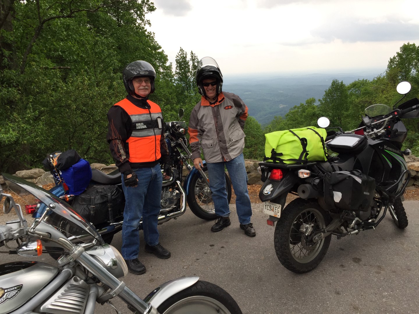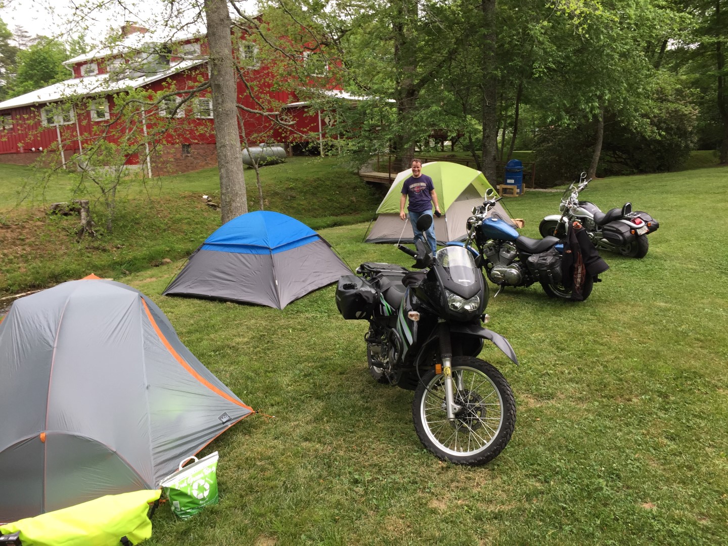 They found the facilities at TWO in tip top shape and couldn’t believe they were the only ones not scared off by the weather! As they set up tents next to the babbling brook, they marveled at their good fortune (and good cell service) to fire off a few “your bike should be here” pics – and wondered if they could get as lucky tomorrow. After a hearty dinner in the lodge, they tried their best to wear out the porch gliders while enjoying the mountain views – can’t be done. Nighttime temps were only about 60 and they slept well.