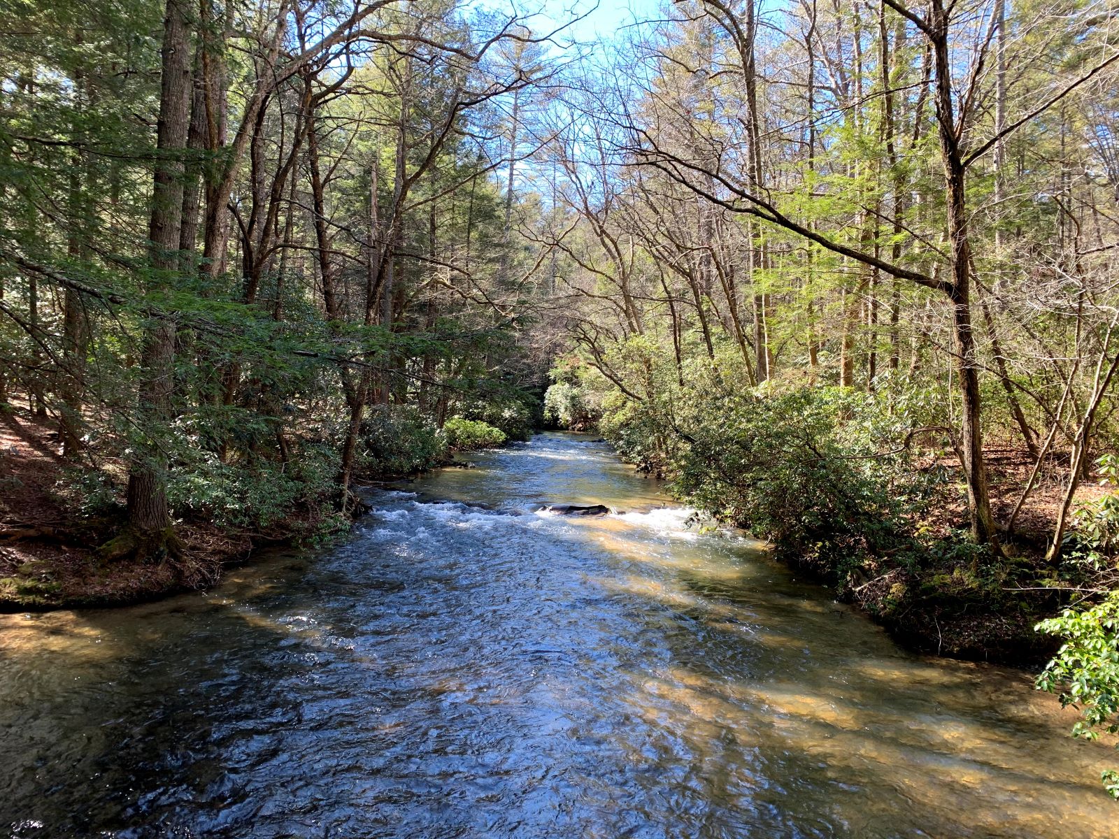 On the way home, they decided to stop at the Wildcat Tract of the Dawson Forest which is bordered by Big Canoe (S), Steve Tate Rd (E ), Hwy 136 (N) and Monument Rd (W). The only vehicle-accessible area is off a ½ mile FS road just a little N of Big Canoe (although there is a “top of the mountain” trailhead on Monument Rd just a bit S of the Eagles Rest park we’ve visited a few times). It was a pleasant ride in the now-51 degrees to the parking / camping area on the banks of the Amicolola River. Judging from the number of cars, but complete lack of tents, plenty of day hikers were enjoying the trails. If you’re not familiar with this tract, it’s a real gem and close to home as well. One trail offers 4 different waterfalls. Ask the googler for details.