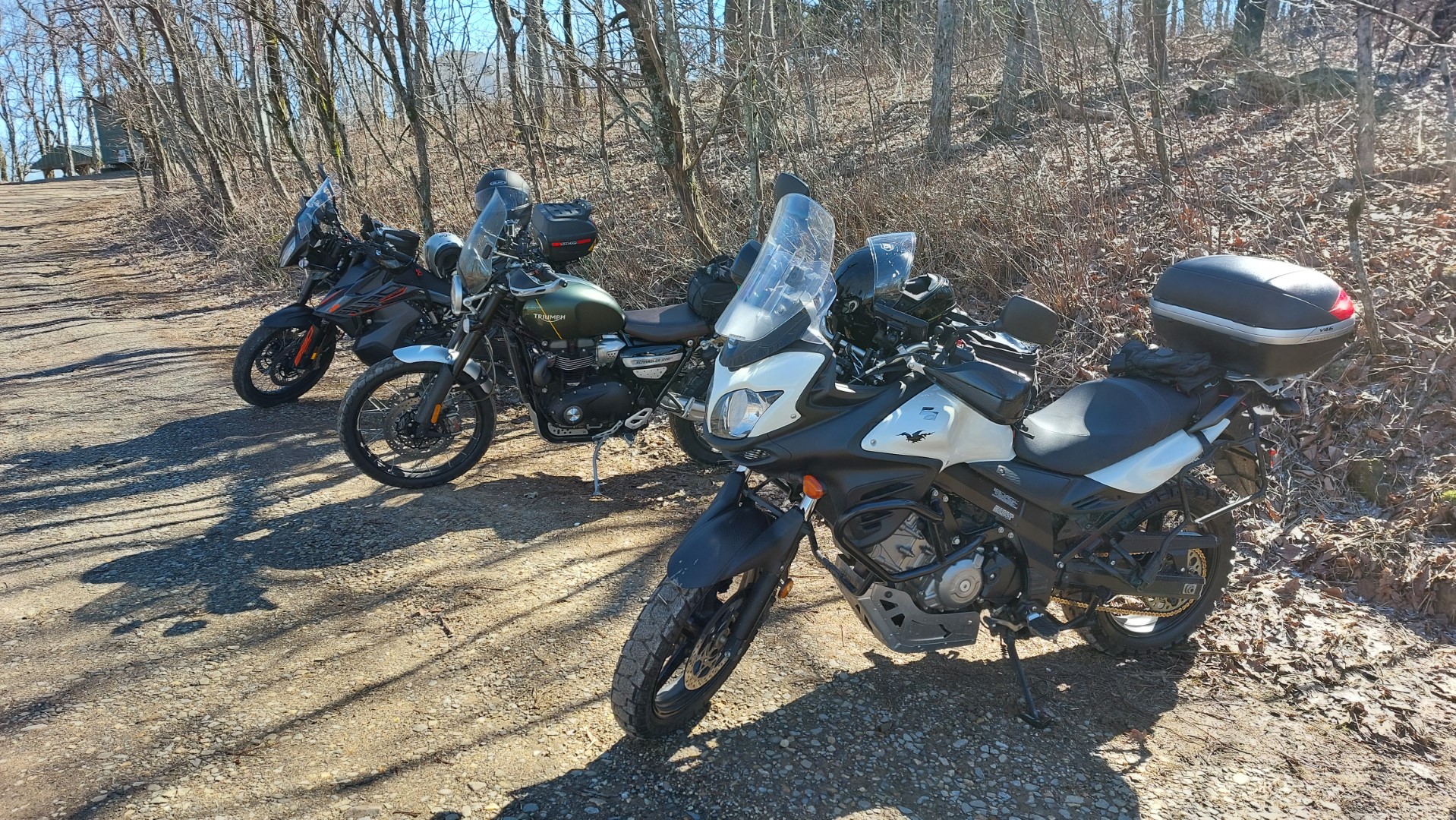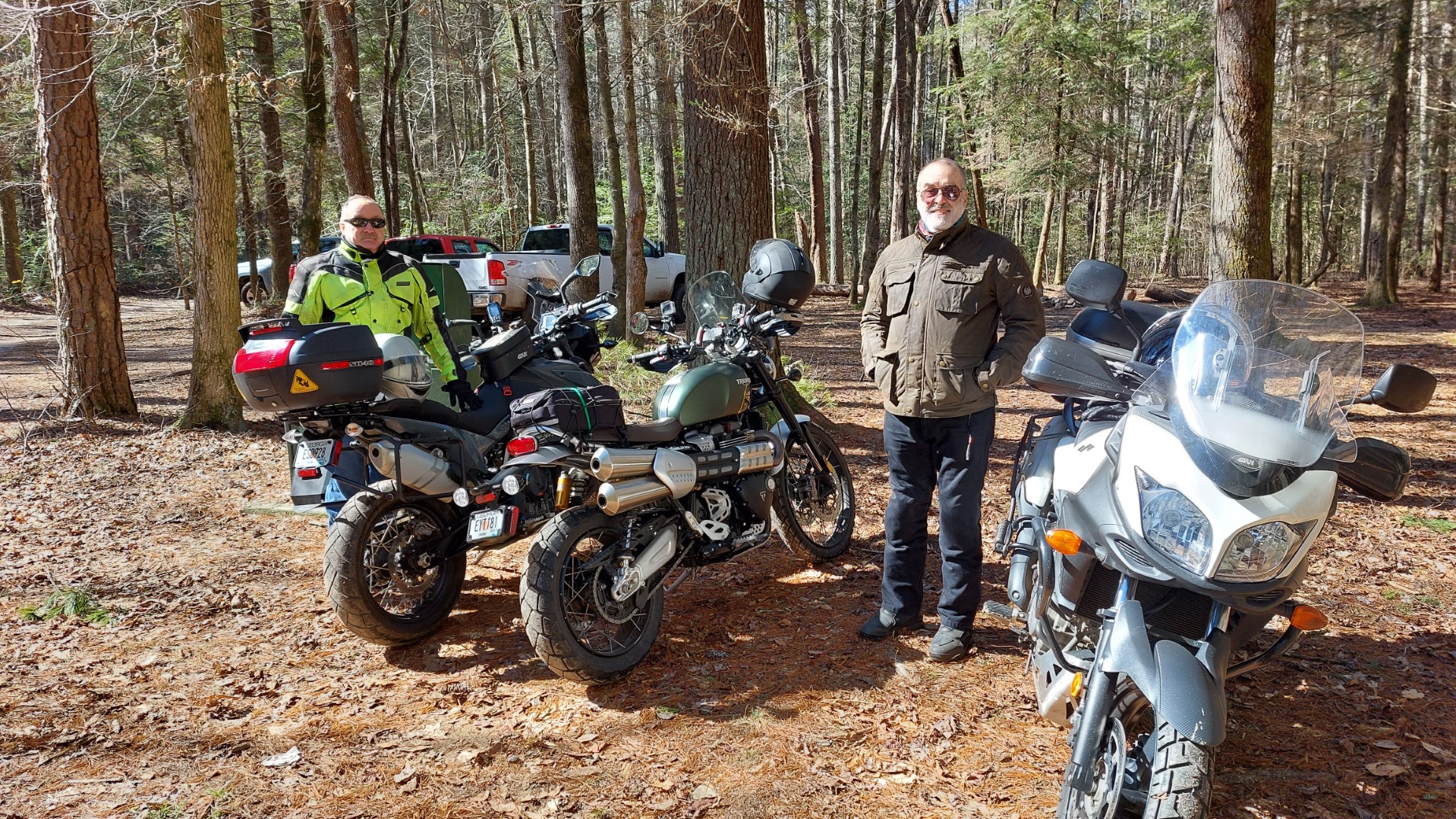 First stop was the Wildcat Tract of the Dawson Forest, which shares the north border of Big Canoe from Steve Tate on the East and Monument Rd on the West. Here a short, but very enjoyable piece of forest service trail riding christened Dan's new Triumph Scrambler with "First Dirt". The way in was downhill and having forgotten to set the off road mode at the top of the trail, Dan discovered that the Scrambler can't be set into off road mode while the bike is in motion (all other modes can be engaged at the flick of a switch while moving).
