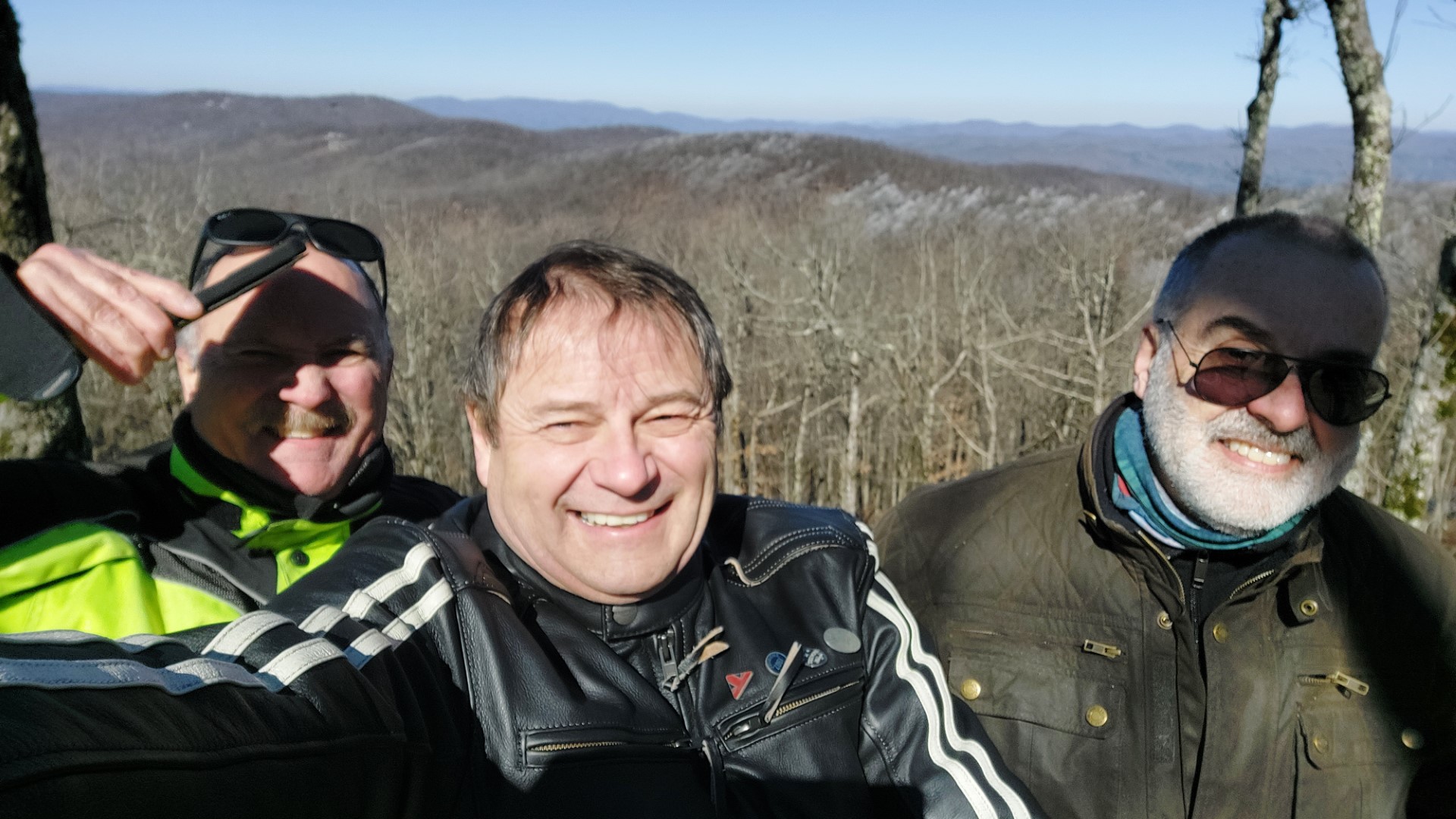 At the top the bikes were parked by the lookout which presented a "then and now" photo op, contrasting this day to a ride here years ago. It seems the trees weren't the only things that had some white decoration on top today compared to the previous time we were up here!