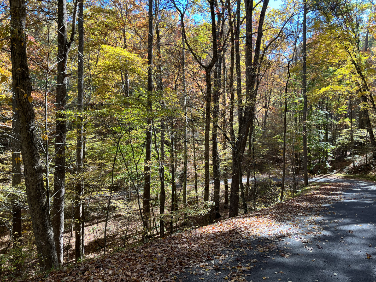 After camp was set up, there was still some good riding time left before dinner so Larry took the group up Hwy 60 to an “off the beaten path” road we hadn’t tried before – Old Dial Road. It seemed like an old Forest Service road paved over – very tight, slow and draped in beautiful fall color - and no one else on it (which worked well since it’s only a “lane and a half”)!