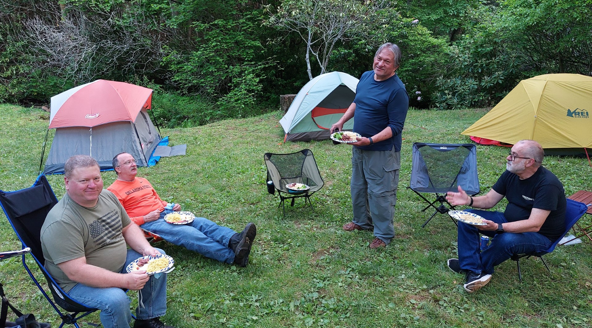 Since the typical BRP speed limit is 45 mph, riding was relaxing enough to enjoy the scenery and since northern schools were still in session, we didn’t experience the large crowds which can overwhelm the summer season. The evening destination was camping at Willville Bike Camp (similar to TWO in Suches, but without the restaurant). The gang really enjoyed the peaceful camping and cooking atmosphere and had to layer up as the evening temps dropped.