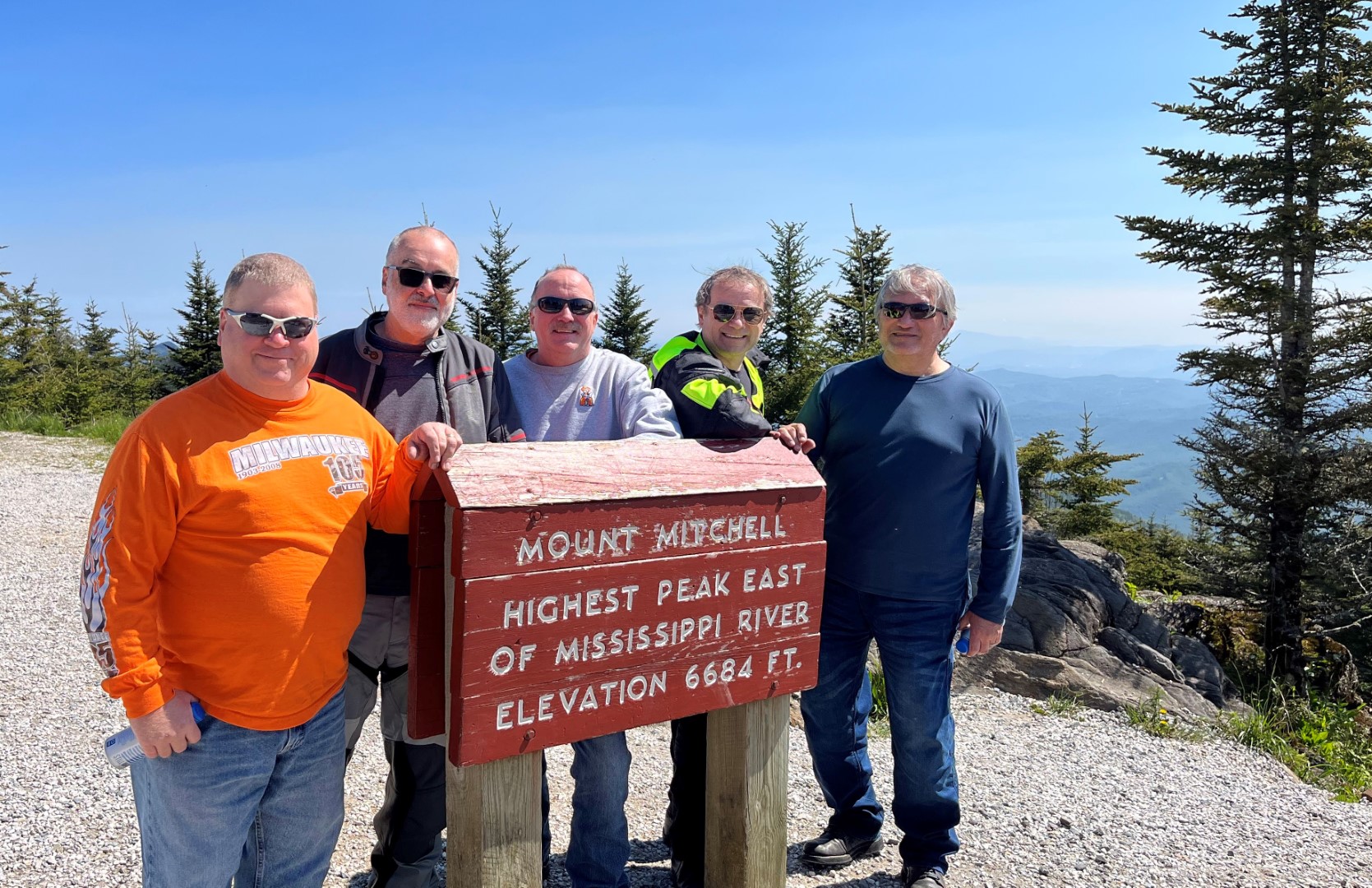 Afterward, Richard departed for his own camping tour of the Smokies and the five headed up the BRP. It was difficult to pick beautiful vantage points because well… they’re simply all beautiful! But highlights of the ride included visiting the top of Mount Mitchell, at 6,700’ the highest point E of the Mississippi, Little Switzerland for ice cream (before lunch even!), and the approach and ride across Linn Cove Viaduct… breathtaking doesn’t begin to cover it!