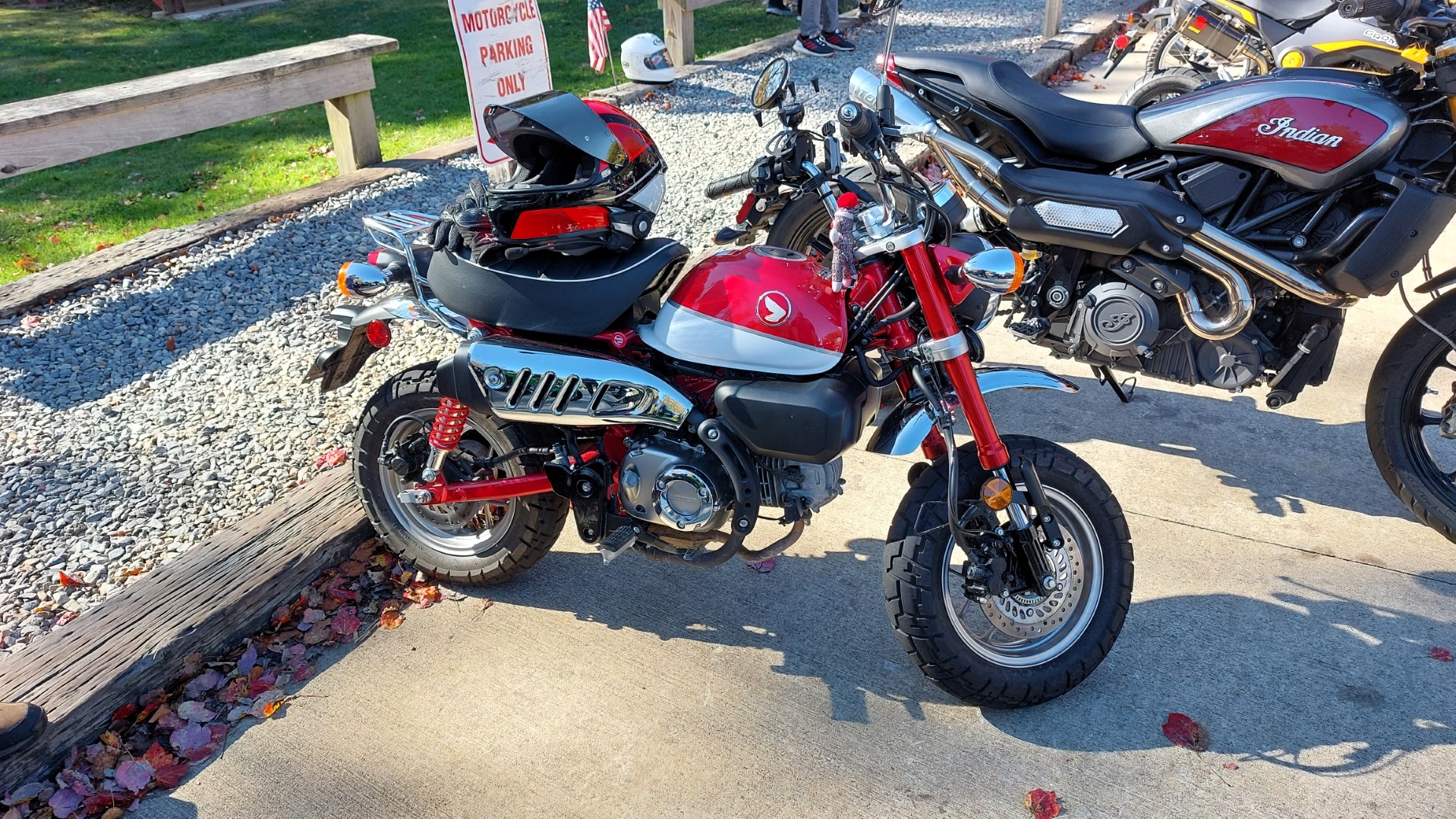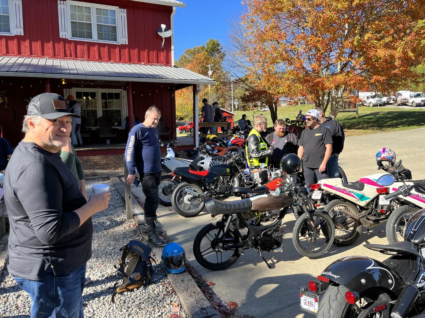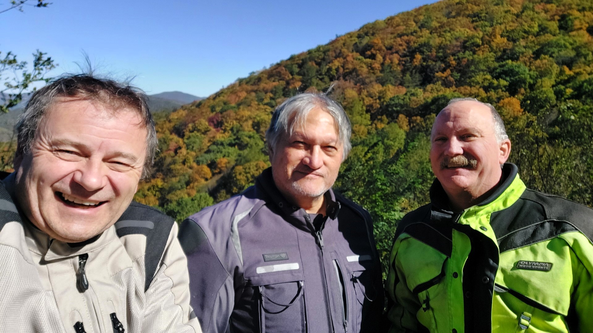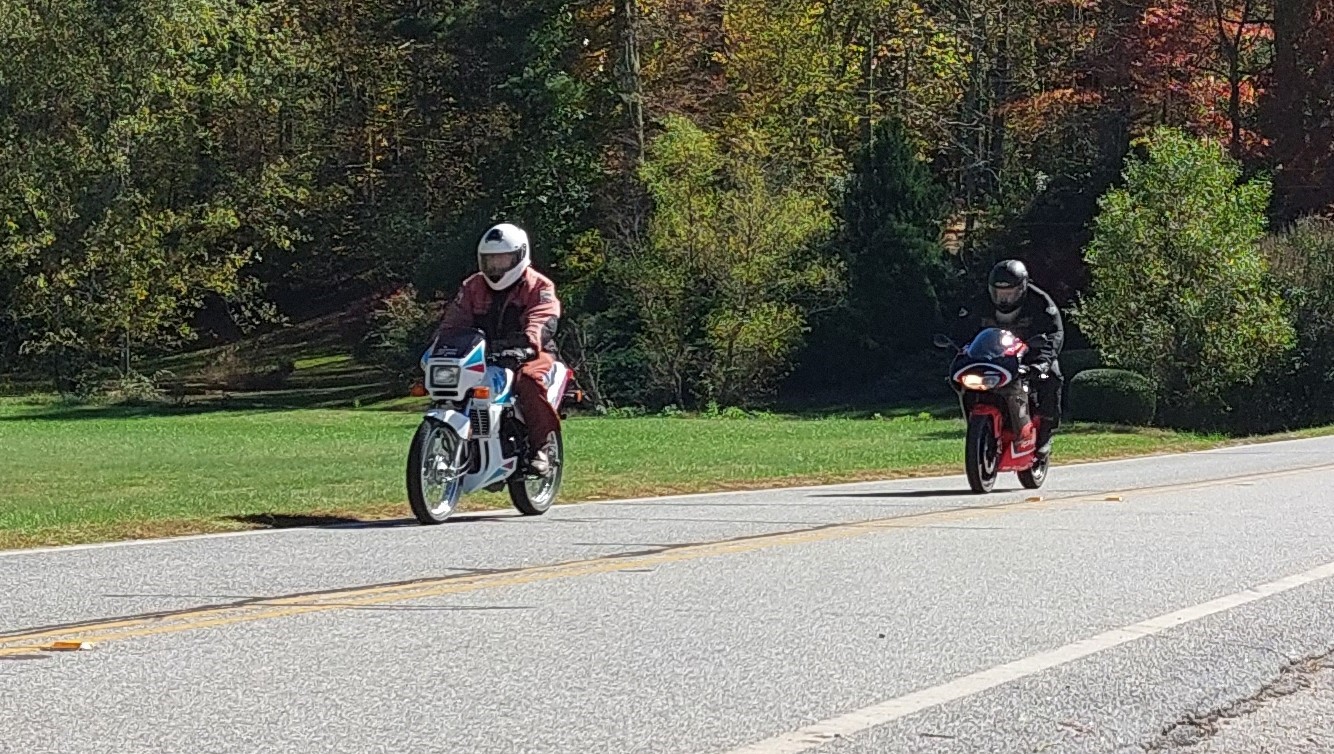 Camping and Riding. Like Peanut Butter and chocolate – does it get any better? On a gorgeous, crisp fall morning, Larry and Dan headed toward Cleveland to meet Mel. The three quickly headed up 75, then westward across Wolf Pen Gap. The leaves had begun to change color and the day’s brisk winds caused them to rain down at times. As they headed down the Richard Russell Scenic Hwy in beautiful sunshine, they stopped to admire the view from the always-scenic Hog Pen Gap.