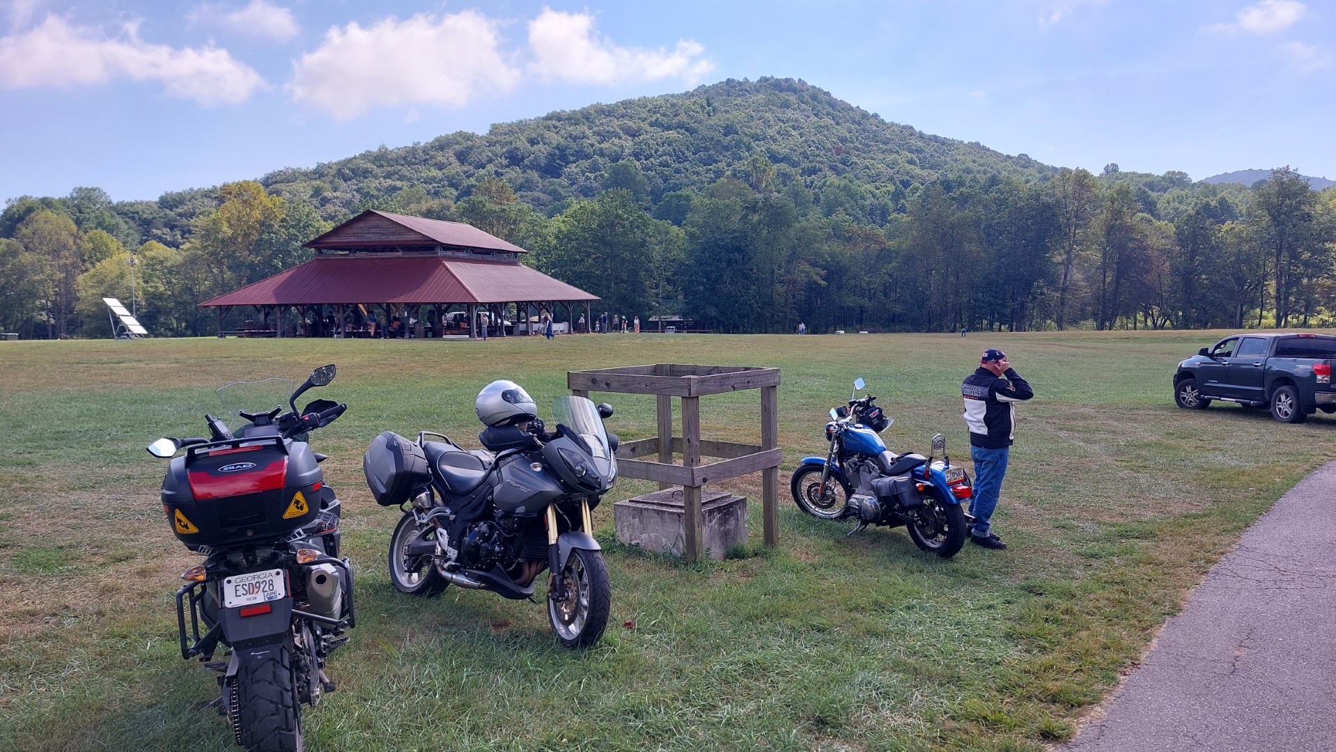 The gang of three headed S down 60 initially enjoying wide sweeping curves which gradually tightened into tight twisties before arriving at Suches – and all traffic free. Next they headed west across Wolf Pen Gap, but made a quick stop to check out Kennedy Creek Resort (f/k/a High Valley) – Ga’s highest airfield. The new owner operates a very nice restaurant and added a gigantic pavilion which that weekend was hosting an “old time music festival”. We wished we had more time to spend with them, but instead will keep an eye on their calendar for interesting upcoming events. Camping at this resort looks first rate.