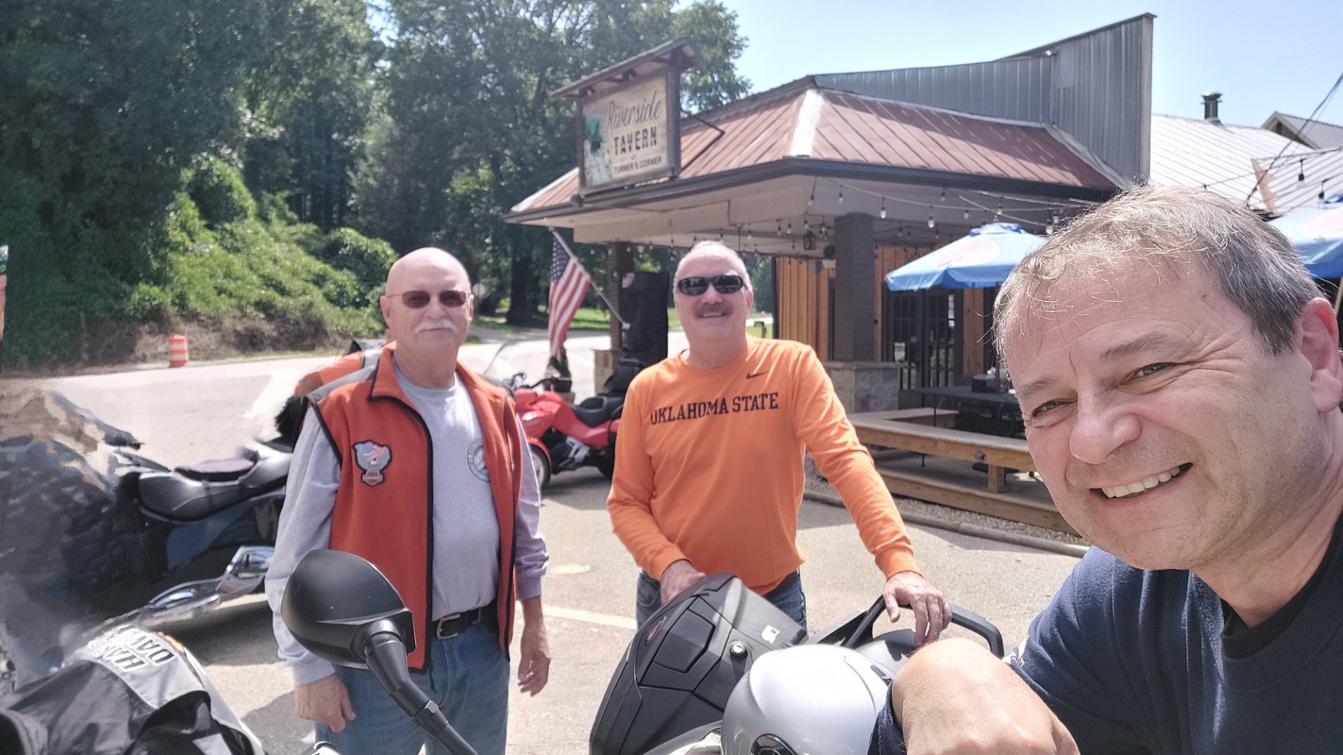 Onward across the always-interesting Wolf Pen Gap (Ga’s Dragon) and then up-and-over Blood Mountain and down to lunch at Riverside Tavern (at Turner’s Corner). None of us had stopped here previously but were impressed and look forward to another visit in the future. There they met a couple Can Am (forward trike) riders and learned more about these unusual rides.