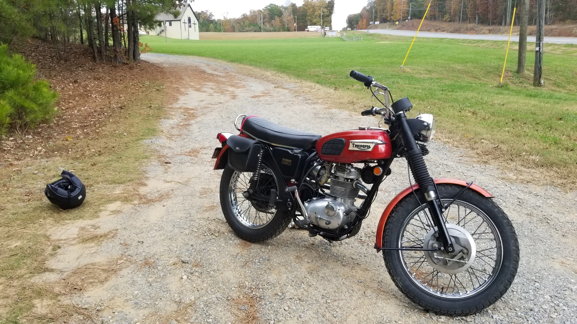 Breaking in on these old bikes is done at 40mph, so it's necessary to be courteous to drivers who get stuck behind you and pull off every now and again to let a backlog of cars go by. I had done this a couple of times on the ride and unfortunately the third time was definitely not a charm in this case. I pulled off on a convenient gravel road and as I rode a U turn the old boy died.